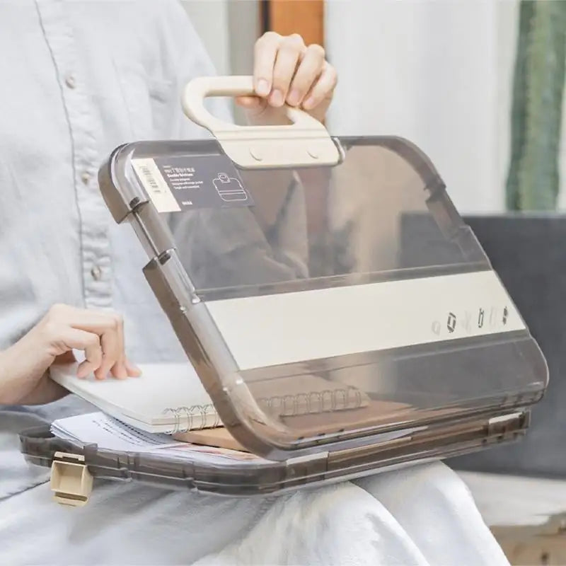 Deze stijlvolle en stevige opbergkoffer houdt al je a4-papieren, notitie blokken en accesoires netjes op één plek. Compact, transparant en makkelijk mee te nemen.